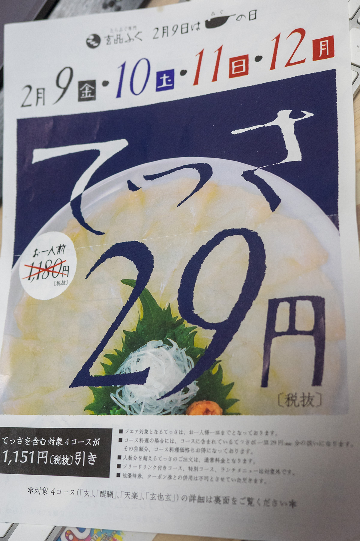 てっさの入ってるコースはその分の1000円くらいがオフになるようだ。白子鍋や焼きと一緒に食べるのもいいかもなぁ。