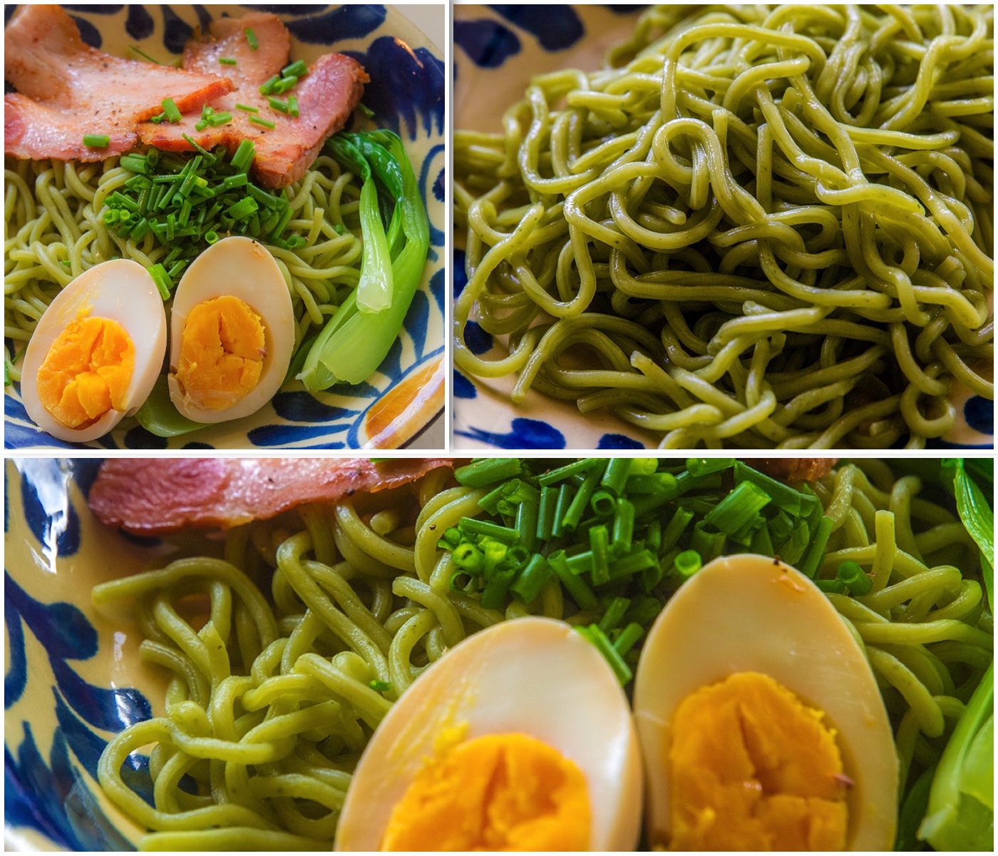 よく水を切って皿に移したら、焼豚、湯がいた青梗菜、味玉、小葱を散らし、柚子ぽんベースのタレを回しかけて出来上がり。