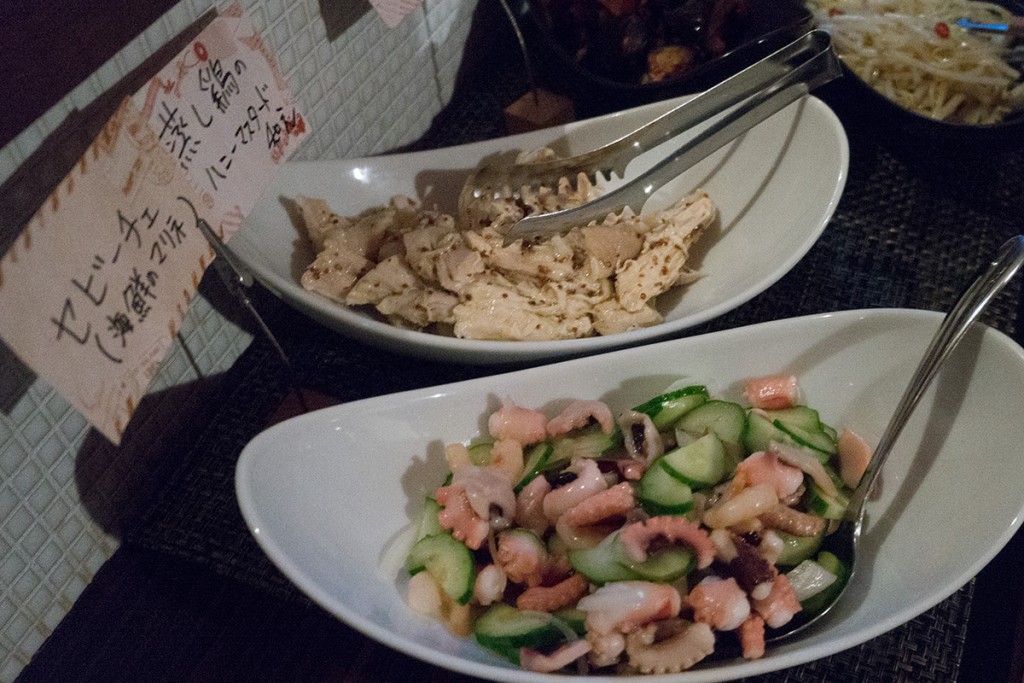 鶏肉やとても食感のいい牛肉のソテーにトロッとした冬瓜やピリ辛のナムルなどバランスがよくてビールもワインもすすむ。
