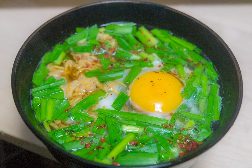 - ニラ水菜チキンラーメンに軟骨ソーキにゆで卵